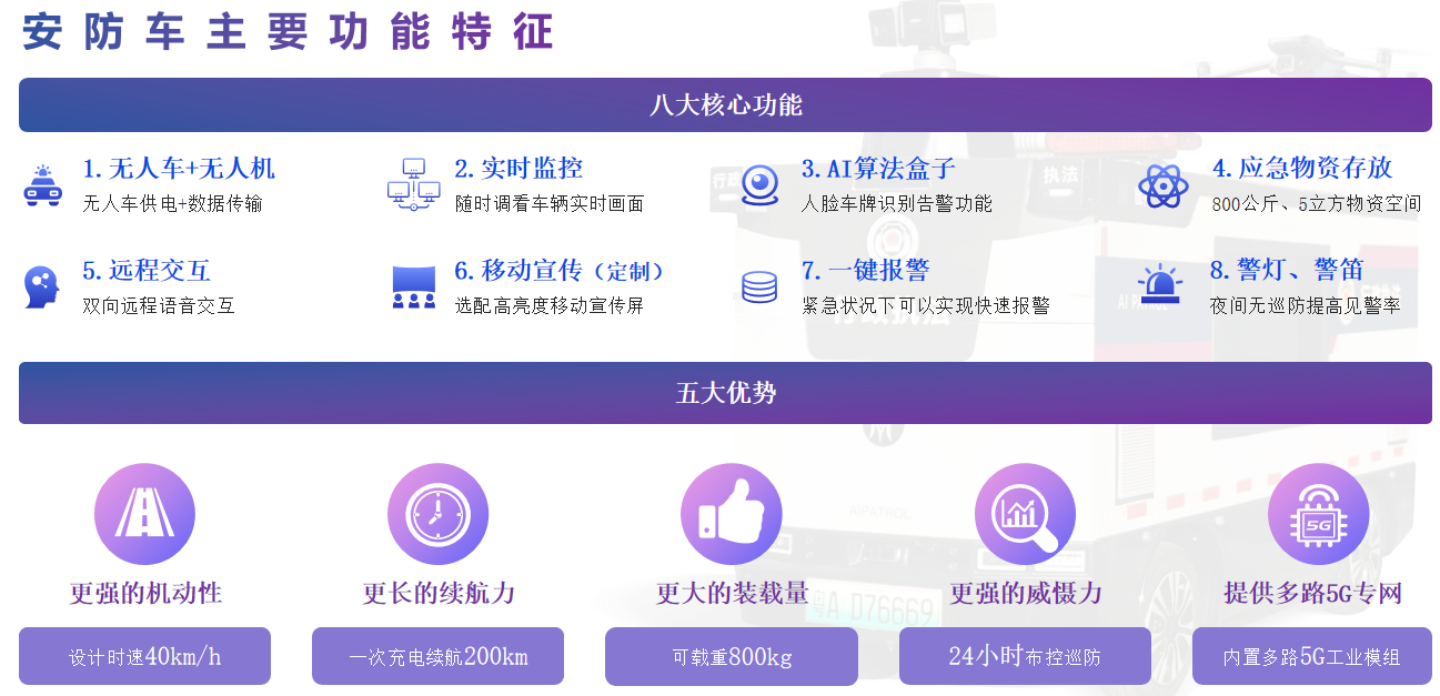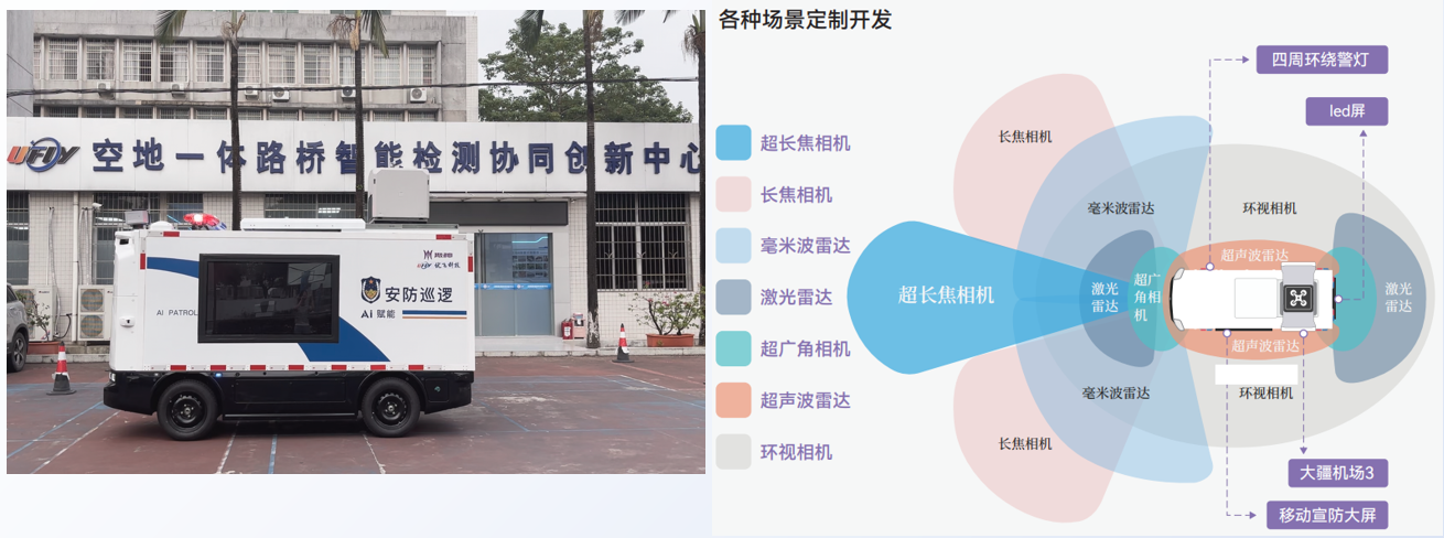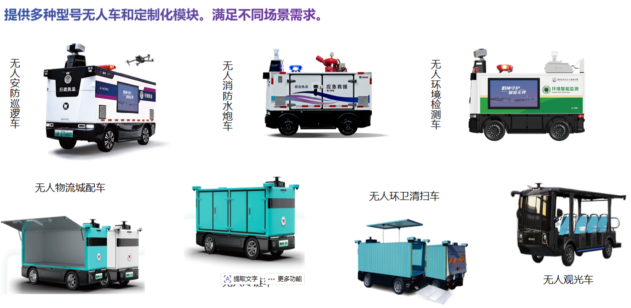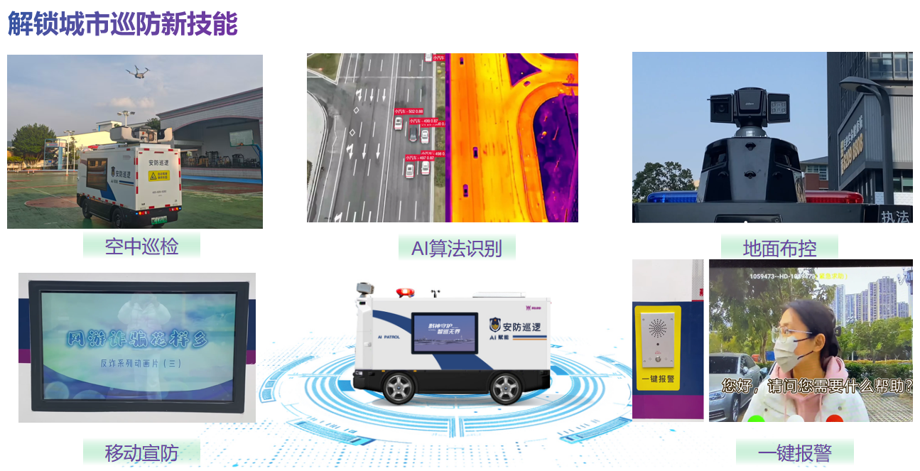近年来,随着人工智能的快速发展和普及,无人驾驶技术在实现城市交通智能化、汽车智能化和提高物流发展效率等方面都发挥了重要作用。公司基于无人车,融合无人机、宣传大屏、警报、警灯、语音对讲、LED屏、布控球、强光灯、大气微站、应急等装备,打造空地融合AI智控应用,广泛应用于公安巡逻、园区安防、应急指挥、环境监测、无人配送等场景。